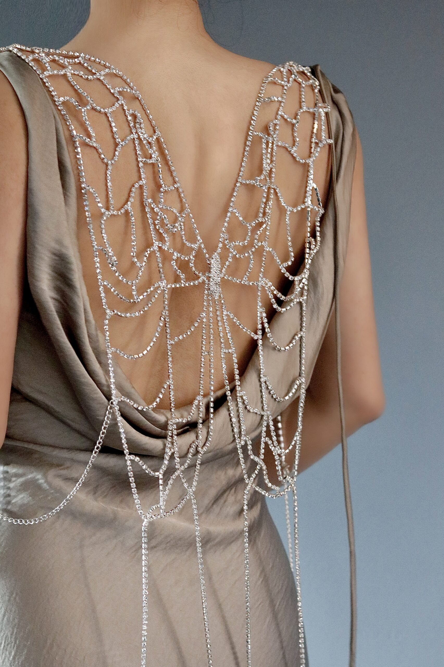 This butterfly spans your shoulders in crystallized rebellion – each chain positioned to create rumors, start conversations, end relationships (the boring ones). The engineering is invisible, the impact isn’t. Every backward glance becomes a double-take, every exit creates a small crisis for whoever’s watching.